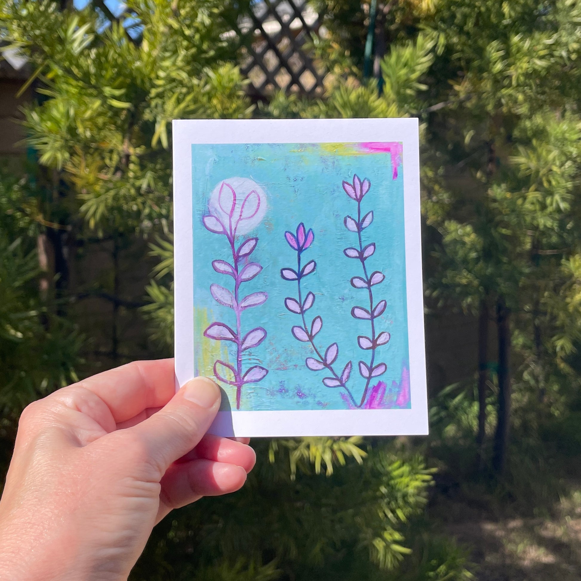 This beautiful 4" x 5" card features a reproduction of my original painting, "Luz de la Luna". It is printed on premium matte card stock and comes with a white envelope. The title of the painting and my name are listed on the back and the inside is blank with space for a personalized message. Packaged in a clear plastic bag these cards are colorful and fun for everyone on your list!